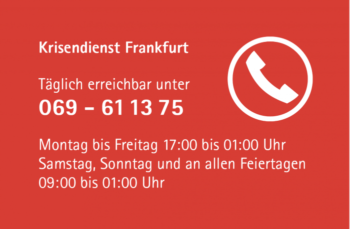 Kompetente Begleitung in Krisensituationen unter 069 611375 von Mo bis Fr, 17 bis 1 Uhr nachts, an Wochenenden/Feiertagen, 9 Uhr morgens bis 1 Uhr nachts.